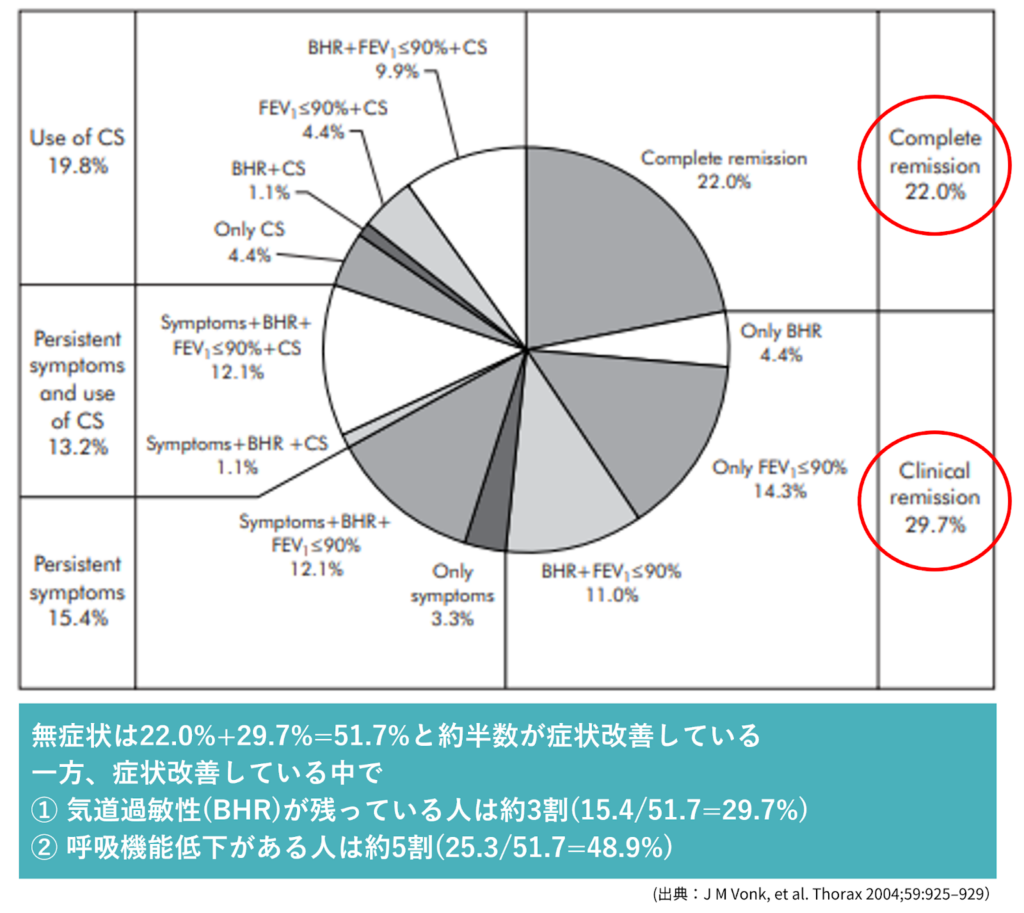 症状がなくなった方の中で、本当に気道の状態まで改善していた(完全寛解)人は約4割(43%)でした。