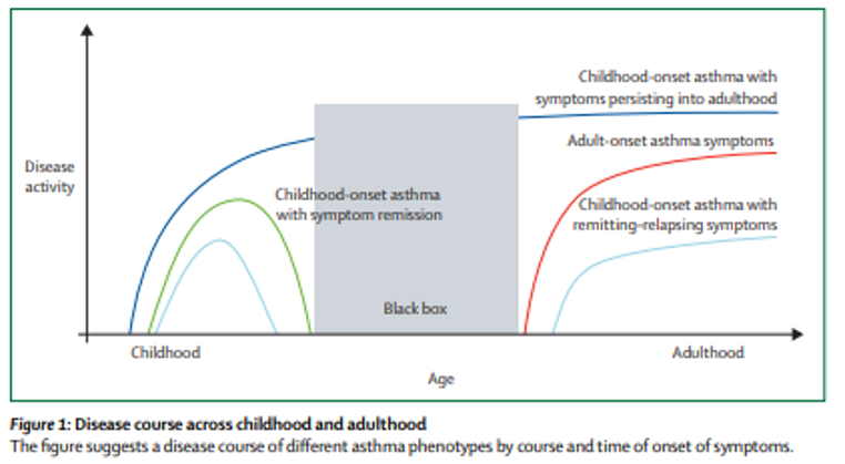 喘息と一口に言っても、その経過は一人ひとり異なります。以下の図は、子供の頃に発症した喘息が、大人になるまでどのように推移するかを示したモデル図です。